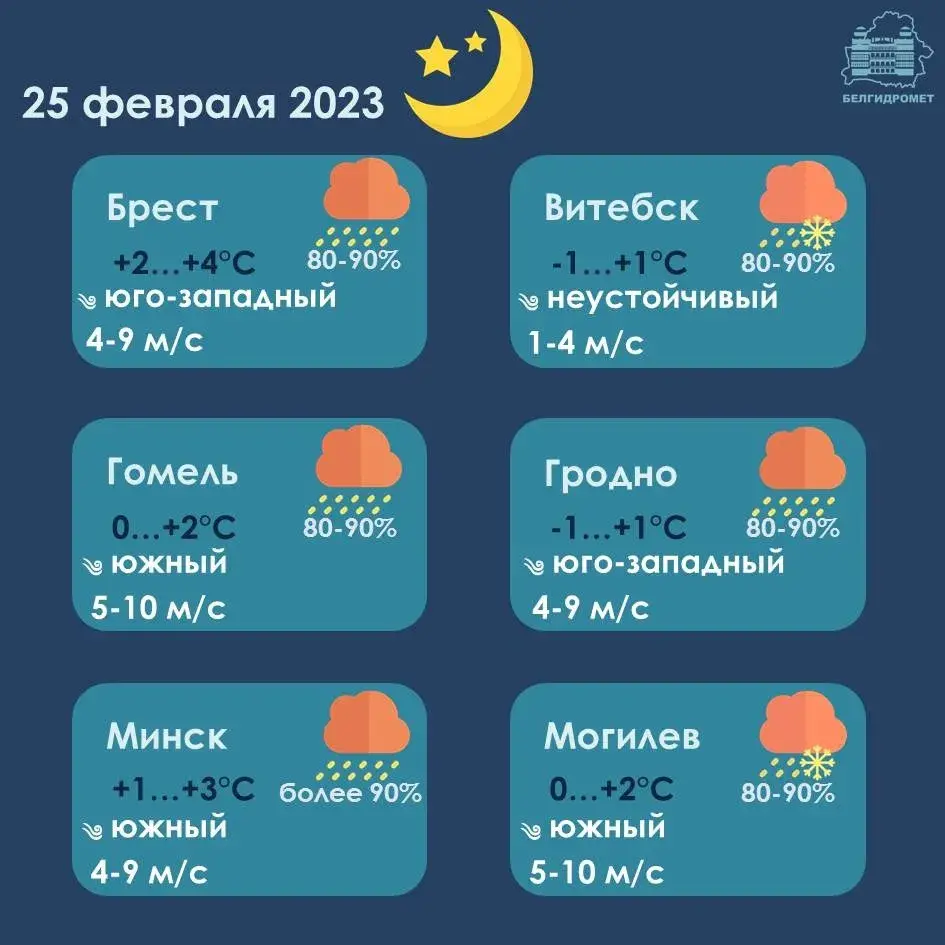 У суботу, 25 лютага, у Беларусі чакаецца пераважна воблачнае надвор'е, паведамляе Белгідрамет.