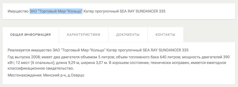 Раней Sea Ray 335 быў ва ўласнасці ЗАТ "Гандлёвы Свет "Кальцо" (былы рынак "Малінаўка").