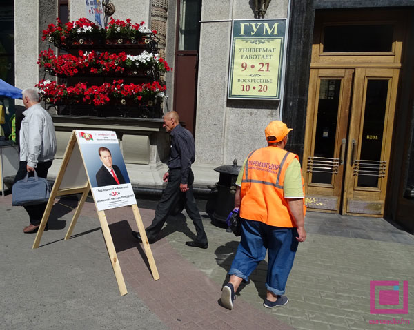 На невялікім кавалку праспекта Незалежнасці ад ГУМа да ўніверсама “Цэнтральны” ў 11 гадзін пятнічнай раніцы ўжо стаіць 7 пікетаў: 2 за Таццяну Караткевіч, 2 за Аляксандра Лукашэнку, 2 за Віктара Цярэшчанку, 1 за Сяргея Гайдукевіча і 1 за Сяргея Калякіна.