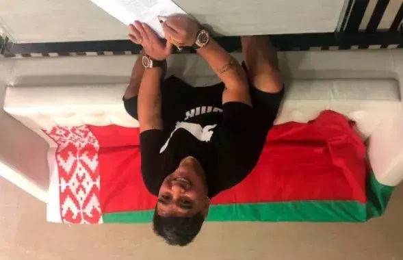 Дыега Марадона (справа) трымае беларускі сцяг. Фота: Instagram-акаўнт Маціяса Морлы.