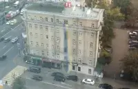 The flag was stretching six floors down and covering the front of the building in downtown Moscow. -