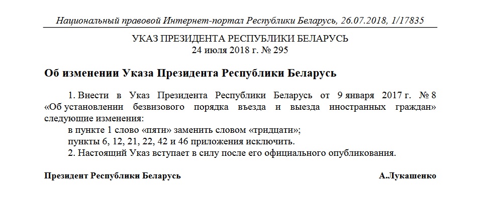 President Lukashenka's Decree No 295 extending the visa waiver for foreign visitors from 5 to 30 days has been officially published on the National Legal Information Portal. Belarusian Foreign Ministry told Euroradio the new edict will become effective on 27 July. The decree amends the document adopted in January 2017 introducing the 5-day visa-free period. Under the new document, 6 countries have been removed from the list of 80 countries to which this edict applies - Argentina, Honduras, Hong Kong, Macau and the Order of Malta. Euroradio reported earlier the list does not contain the countries, which have in place the bilateral agreements with Belarus on visa-free travel.