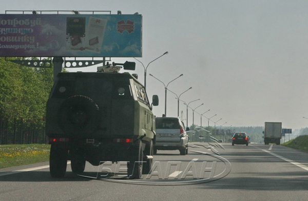 The armoured car may be the Belarusian experimental model Bars, BelaPAN reports. It is being tested now. The car may be sued by the army in the future.
