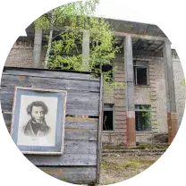 A portrait of Pushkin is nailed to the bulletin board at the House of Culture. Inside there are some old things: black-and-white photos in a file, divided into headings with titles like "Our work", "Our rest", etc. People come here during Radunitsa to visit the tombs of their relatives and to take a walk in the places of their youth.