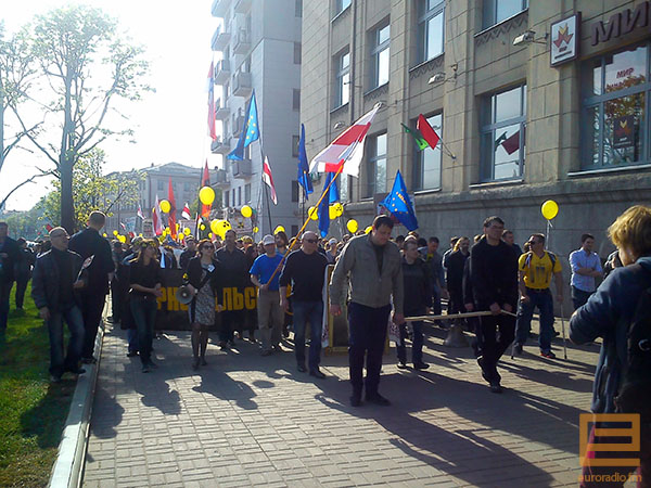 16:00 Alternativa members are holding the banner For Independent Belarus. People have brought many yellow balloons with the radiation sign, Ales Piletski reports.