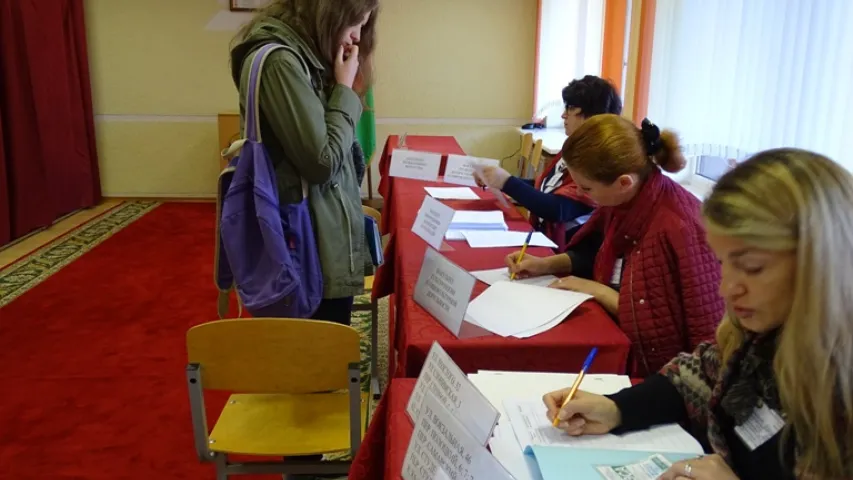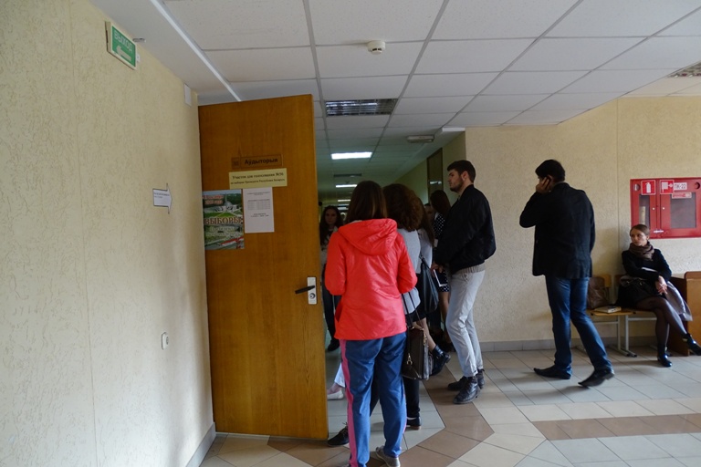 It is not yet ten c'clock -- time when the polling station #56 opens in the Belarusian University of Culture and Arts, but there are already a few students at the door. The majority of students, in groups of ten or twenty people -- will come over in between the classes.
