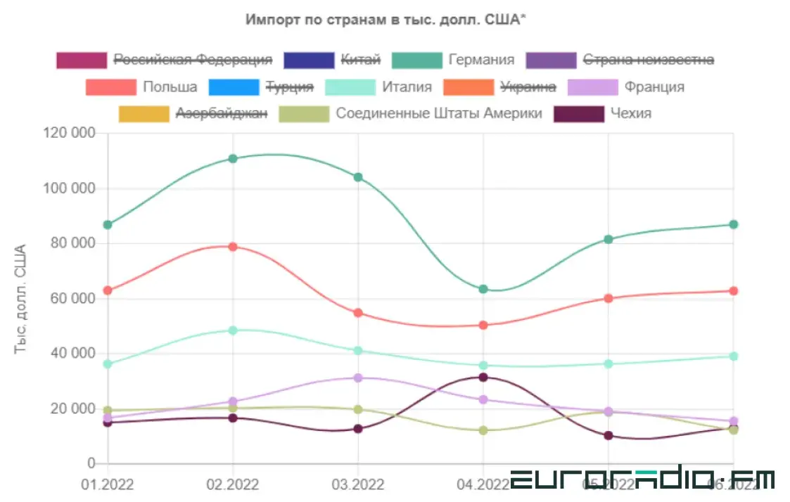 Imports from Europe increased: from $322 million in May to $337 million in June. But not only the European market is important for Belarus but also the purchases there. After all, to produce goods for sale even in Russia, you need high-quality intermediate components that Belarus cannot make itself. What problems can arise without these components can be seen in the production of MAZs, which have repeatedly caught fire in Russia. There, European parts were replaced by "similar" domestic ones.