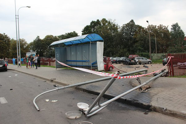 According to BelTA, a speeding Seat Ibiza rammed a crowded bus stop. The car hit two lighting poles and fencing of the parking lot, eventually crashing into a car.