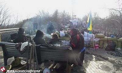 The entrance is blocked by a protesters’ barricade now. They are warming up near a fire. About three metres of the bridge surface has burnt down near Grushevski Street – tyre casings were brunt there, news.liga.net reports.