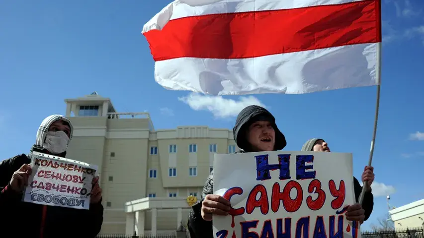 An unauthorized protest action took place on Saturday, April 2 - the Day of Unity of Peoples of Belarus and Russia - near the Russian embassy in Minsk. It was organized by the Young Front organzation registered in Czech Republic. Over a dozen young people were seen holding posters and white-red-white flags to protest against "Russian chavinism and imperialism."