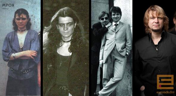 "Mroya" musician Lyavon Volski followed that time's fashion: long hair, makeup... However, Lyavon gained a respectable look during the 90s. The second-to-last photo is taken at the times of the "Three Turtles" album, the last one - at the times of the "House of Culture" album.