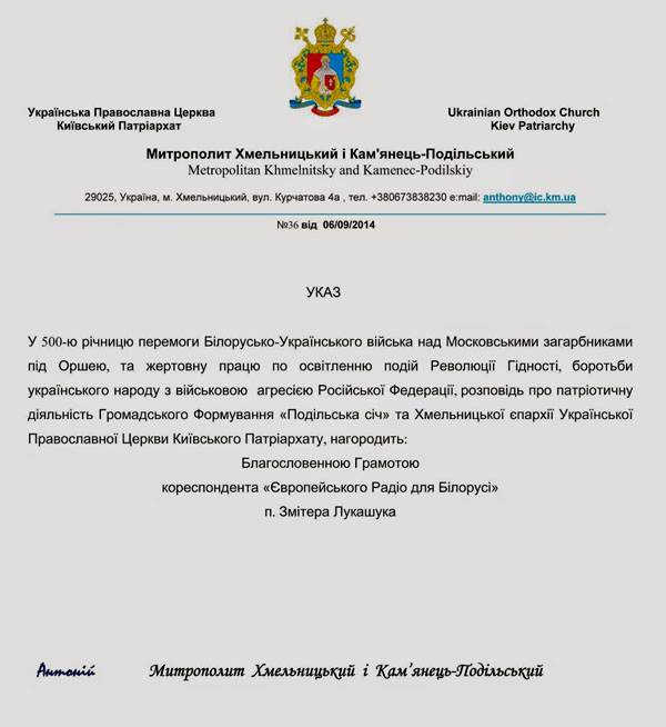 Metropolitan of Khmelnistk and Kmenetsk-Podolsk Antoni has signed the corresponding order. The award is dated for the 500th anniversary of ‘the victory of the Ukrainian-Belarusian army in the battle against Moscow near Orsha. Metropolitan Antoni noted the journalist’s ‘selfless work on covering the events of the Revolution and the struggle of the Ukrainian people with the military aggression of the Russian Federation’.