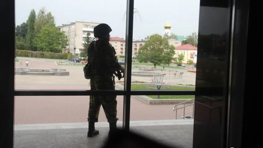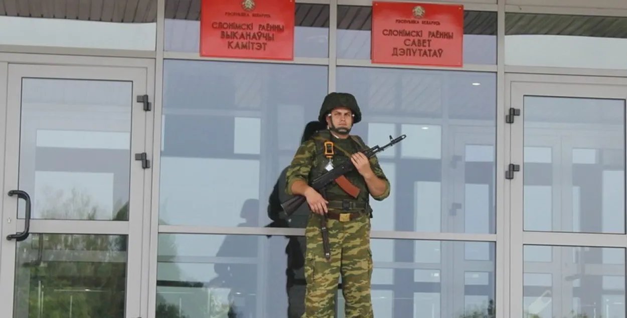 Будынак Слонімскага райвыканкама ахоўвалі аўтаматчыкі. Як піша “Газета Слонімская”, узброеныя вайскоўцы з’явіліся на ўваходзе ў адміністрацыю раёна 7 верасня, бліжэй да абеда.
