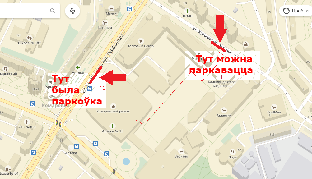 Еўрарадыё расшукала паркоўку, пра якую кажа Віталь Міхайлавіч. Яна знаходзіцца ўздоўж вуліцы Кульман на паўночным баку Камароўкі. Па-першае, ад яе да рынка ісці на 300 метраў далей. А па-другое, кожны, хто быў на вуліцы Кульман, ведае, што прыпаркавацца там нерэальна. Удзень там сноўдаюць наведнікі рынка і гандляры, уночы ― аматары шаўрмы і іншага фаст-фуда, якім там гандлююць круглыя суткі.