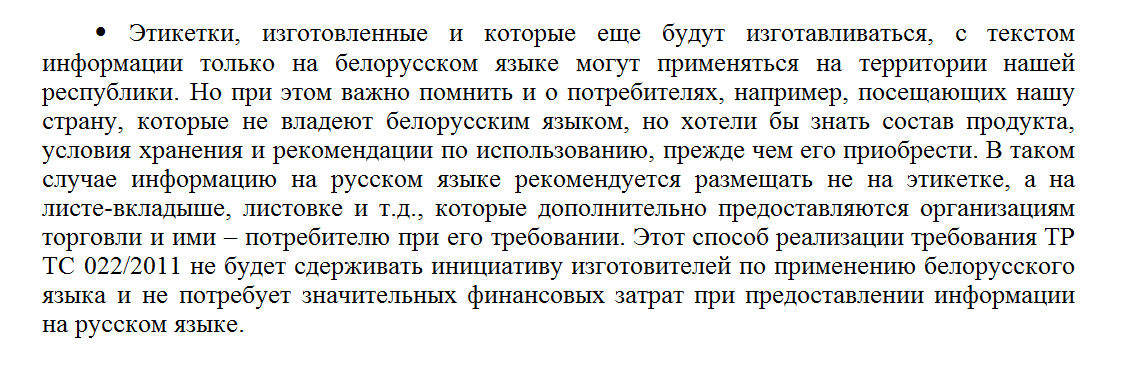 Папярэдняя рэдакцыя стандарта дазваляла друкаваць этыкеткі на любой з дзяржаўных моваў, прынятых у Беларусі. Але сёлета дакумент прывялі ў адпаведнасць з Тэхнічным рэгламентам Мытнага саюза ТР ТС 022/2011. А ў ім сказана: "...нанесеная ў выглядзе надпісаў маркіроўка упакаванай харчовай прадукцыі павінна быць нанесеная на рускай мове і на дзяржаўным (ых) мове (ах) дзяржавы-члена Мытнага саюза пры наяўнасці адпаведных патрабаванняў у заканадаўстве (ах) дзяржавы (аў) -члена (аў) Мытнага саюза" (пункт 4.2)". То бок, руская мова — абавязковая, іншыя дзяржаўныя мовы — па жаданні дзяржаваў.