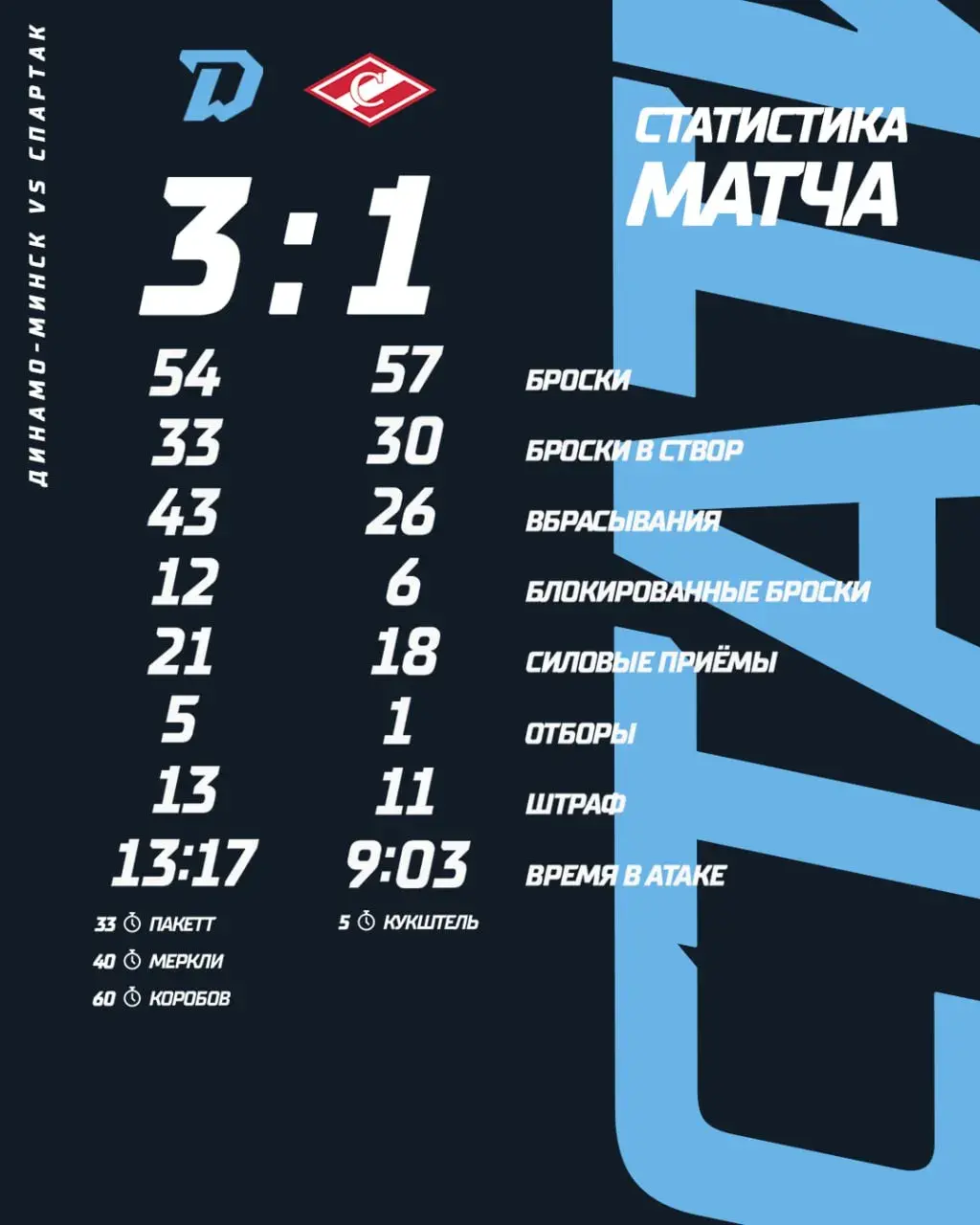 Хакеісты мінскага "Дынама" ў чэмпіянаце КХЛ выйгралі важны матч у маскоўскага "Спартака" — 3:1 (0:1, 2:0, 1:0). Шайбы ў дынамаўцаў на рахунку Седрыка Пакета, Ніка Мерклі і Дзмітрыя Корабава.