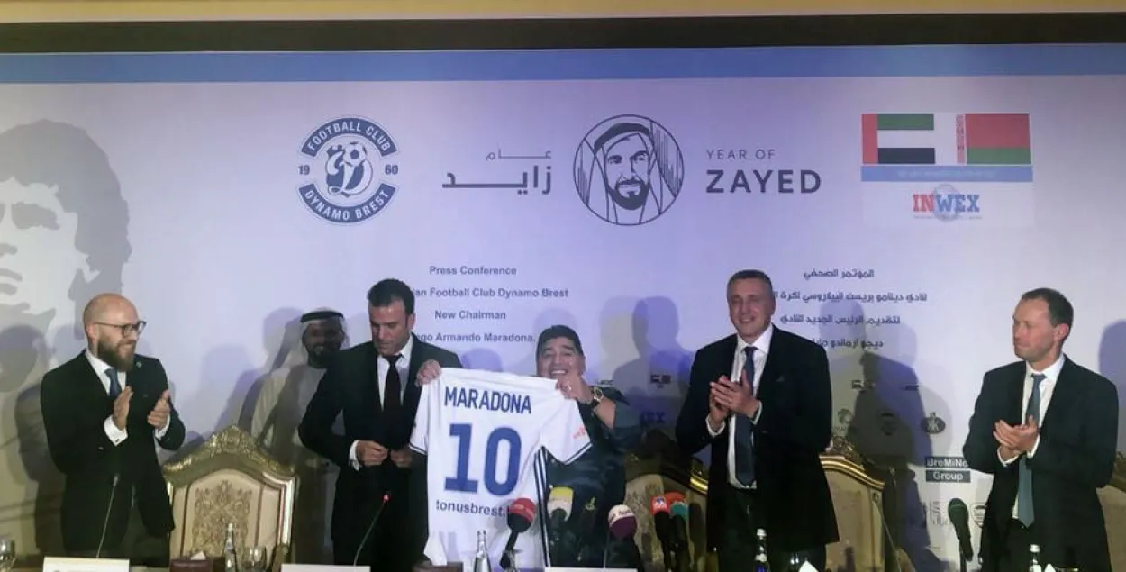 Дыега Марадона атрымаў майку брэсцкага "Дынама" з 10-м нумарам і пацалаваў яе. У аўторак у Абу-Дабі прайшла прэс-канферэнцыя, на якой знакамітага аргентынца прадставілі ў якасці старшыні праўлення беларускага футбольнага клуба. Як вядома, сваю працу ў Брэсце Марадона пачне толькі ў ліпені пасля заканчэння чэмпіянату свету па футболе ў Расіі. Аднак ён уважліва сочыць за "Дынама", выступае з відэазваротамі да каманды. Дынамаўцы яго пакуль толькі радуюць — заваявалі Кубак Беларусі.