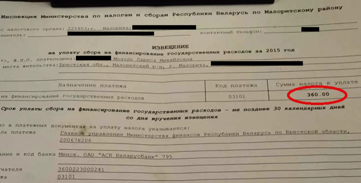 7 снежня Валянціна Кавальчук з Маларыты атрымлівае квітанцыю з падатковай інспекцыі. З паперы вынікае, што яе дачка Ларыса Мазоль мусіць заплаціць дзяржаве 360 рублёў — збор на фінансаванне дзяржаўных выдаткаў, які ў народзе называюць падаткам “на дармаедства”.