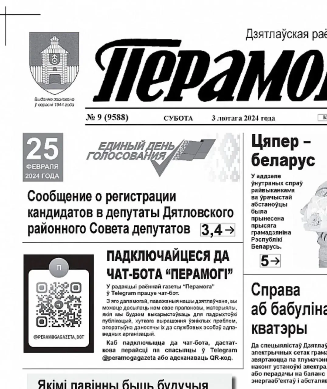 Дзятлаўская раённая газета "Перамога" асвойвае сучасныя платформы і прапануе чытачам з дапамогай QR-кода падключыцца да чат-бота ў тэлеграме. Яго назва прадказальна супадае з назвай мабілізацыйнага плана "Перамога", абвешчанага беларускім дэмакратычным рухам.