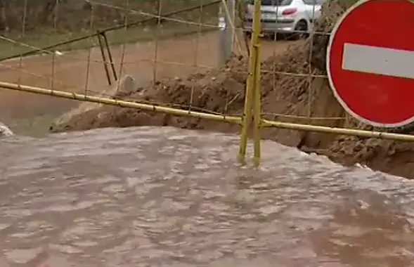 Вада ўзняла асфальт і на вуліцы здарыўся сапраўдны вадапад.