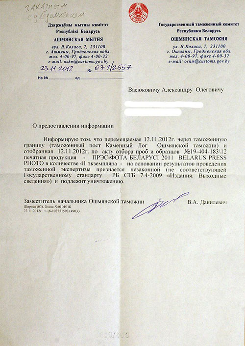 Фотоальбомы, изданные па итогам конкурса "Пресс-фото Беларуси 2011", были конфискованы у фотографов Юлии Дорошкевич и Александра Васюковича в ноябре 2012 года на пограничном переходе "Каменный Лог". Ошмянское отделение таможни проинформировало Васюковича, что данная печатная продукция "признается незаконной (не соответствует Госстандарту РБ СТБ 7.4-2009 "Издания. Исходящие сведения") и подлежит уничтожению". 19 января стало известно, что альбомы переданы в КГБ.