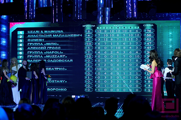 В этом году представителя Беларуси выбирают по новой схеме: 7 голосов от жюри и 1 от зрителей, которые голосуют с помощью смс-сообщений и звонков. Сначала организаторы озвучивают результаты народного голосования, согласно которому исполнителям расставляют баллы от 1 до 12 (за исключением 2 и 11). По мнению зрителей, на первое место выходит брестская группа Muzzart, на второе — Мілкі, третье — Uzari & Maimuna.