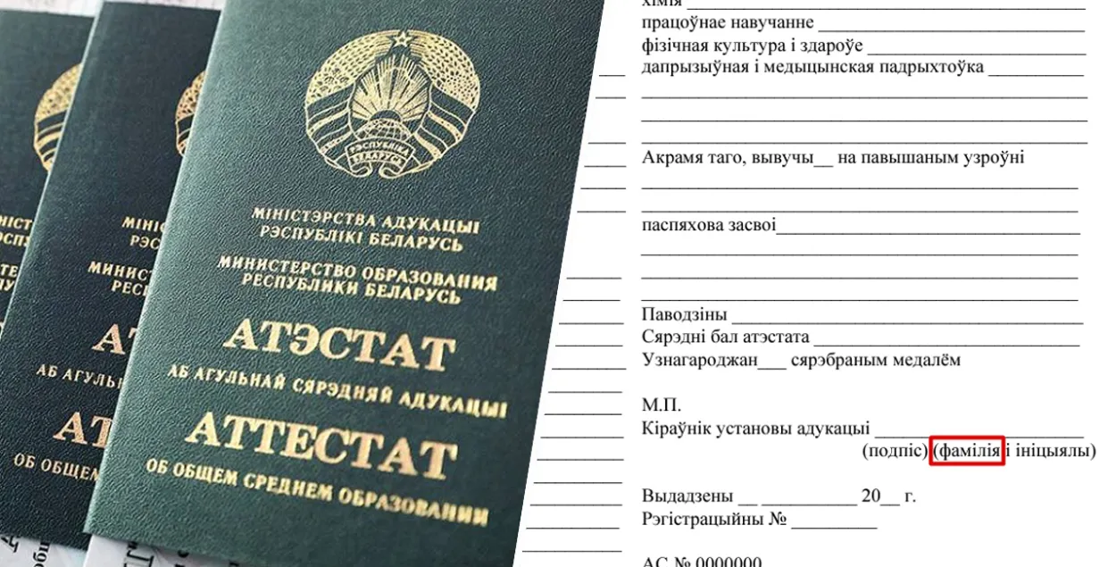 Белорусские аттестаты и дипломы нового образца написаны на трасянке. Во всех документах об образовании вместо слова "прозвішча" используется слово "фамілія". Которое не употребляется в белорусском языке в контексте именования человека.