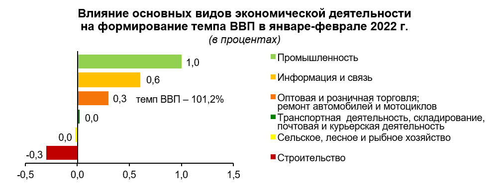 В январе — феврале положительный вклад в рост ВВП традиционно сделали промышленность и информационные технологии. Кроме них, меньший, но тоже рост дала оптовая и розничная торговля, ремонт автомобилей и мотоциклов.