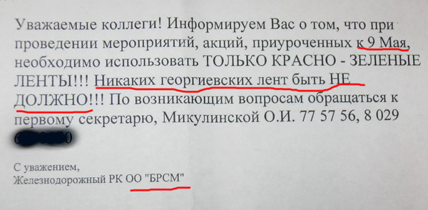 "Информируем вас, что во время проведения мероприятий и акций, приуроченных к 9 мая, следует использовать только красно-зелёные ленты! Никаких георгиевских лент быть не должно!" — фото письма такого содержания попадает в интернет 6 мая.