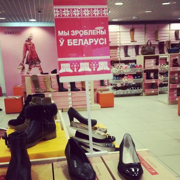Сейчас на входе в обувной магазин "Мегатоп", что в ТЦ "Столица", посетителей встречают коробки с обувью, над которыми красуются вывески "Мы сделаны в Беларуси" в духе модного сейчас национального орнамента. А обувь собственной фабрики "Мегатоп" можно купить по хорошим сезонным скидкам.