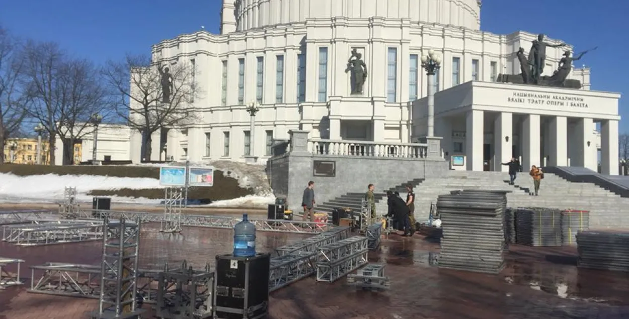 Накануне празднования Дня Воли в Минске полным ходом идет монтаж площадки, на которой 25 марта состоится митинг и концерт. Фотографии с площадки у оперного театра выложил в Фейсбуке лидер движения "За свободу!" Юрий Губаревич. На фото видно, как монтируют сцену, ставят ограждение и даже биотуалеты.