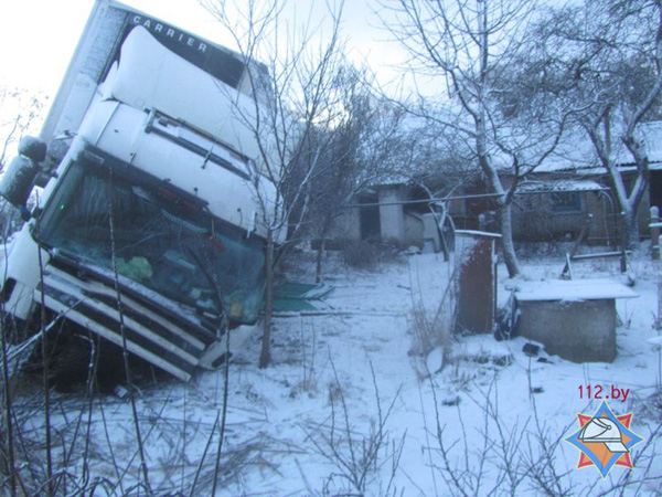 Фура из России не доехала до Польши. Утром 8 февраля в Волковыске она съехала в кювет. К счастью, автопоезд не попал в дом, проехал рядом.