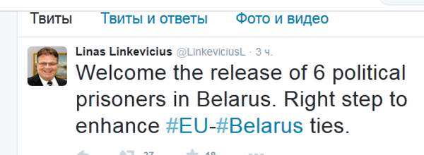 Глава МИД Литвы Линас Линкявичюс прокомментировал освобождение шести белорусских политзаключённых, в том числе и Николая Статкевича. Он написал в "Твиттере" следующее: