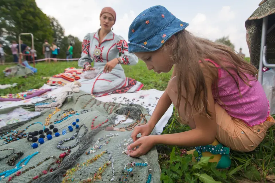 Еще выше — ярмарка, которая, кажется, тоже растет с каждым годом: теперь помимо бус, поясов, вышиванок здесь можно купить и музыкальные инструменты.
