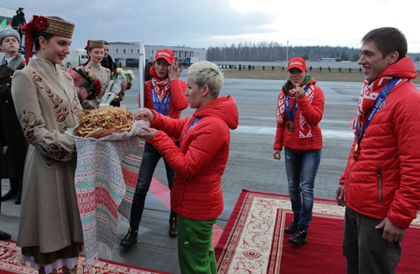 На встрече белорусских олимпийцев из Сочи девушки выглядят чрезвычайно элегантно. Приталенное бежевое пальто, расшитое цветами и бисером, также имеет свою "народную" историю. По словам Елены Галиевской, прообразом костюма стала женская свитка, найденная во время одной из экспедиций "Скарбніцы". Сотрудники "Скарбніцы" вместе с исследователем Марией Винниковой детально изучали особенности свитки, потом на ее основе сделали реконструкцию с использованием современных элементов. То есть сделали ее приталенной, немного видоизменили складки, украшающие вещь сзади, и проработали спину.