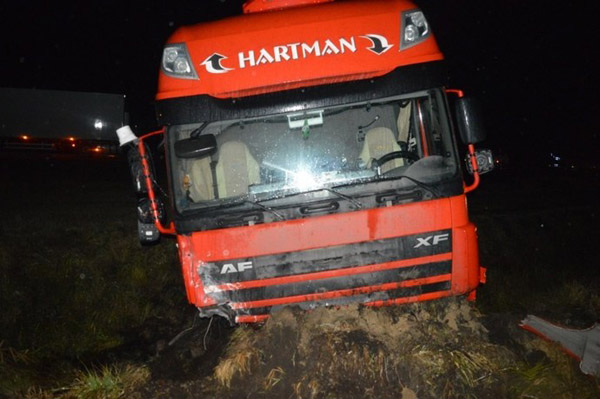 Ночью в пятницу около деревни Лежневичи Ивьевского района произошла авария. На трассе Минск — Гродно легковушку "Рено-Кангу" внезапно выехал на встречную полосу. Водитель автопоезда "ДАФ" с 20 тоннами яблок уходил в сторону, и после столкновения фура оказалась в кювете.