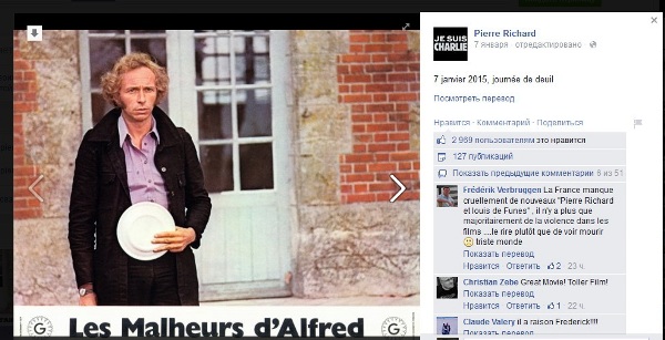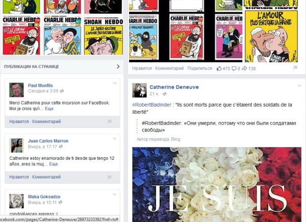 На аккаунтах в Фейсбуке оскароносного французского режиссёра Жана-Люка Годара, актёров Катрин Денёв и Пьера Ришара размещены карикатуры Charlie Hebdo, аватары заменены чёрным окошком со словами "Я — "Шарли"".