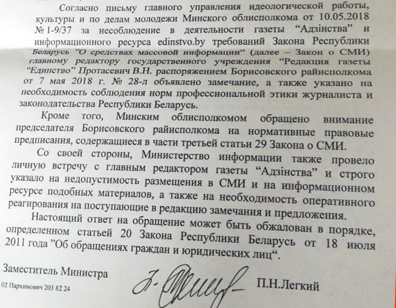 Борисовский райисполком сделал замечание редактору государственной районной газеты "Единство" Вере Протасевич за нарушение журналистской этики. Кроме того, в Министерстве информации провели встречу с редактором и "строго указали" на недопустимость размещения в СМИ и на информационном ресурсе материалов, нарушающих этику.