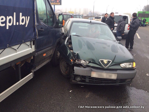 Утром 4 марта в районе Малиновки произошла массовая авария, пишет onliner.by. По данным ГАИ, все началось с Alfa Romeo, за рулем которого находилась девушка. Она двигалась по второй полосе дороги и решила перейти в первую. Но при этом водитель столкнулась с пассажирским автобусом.
