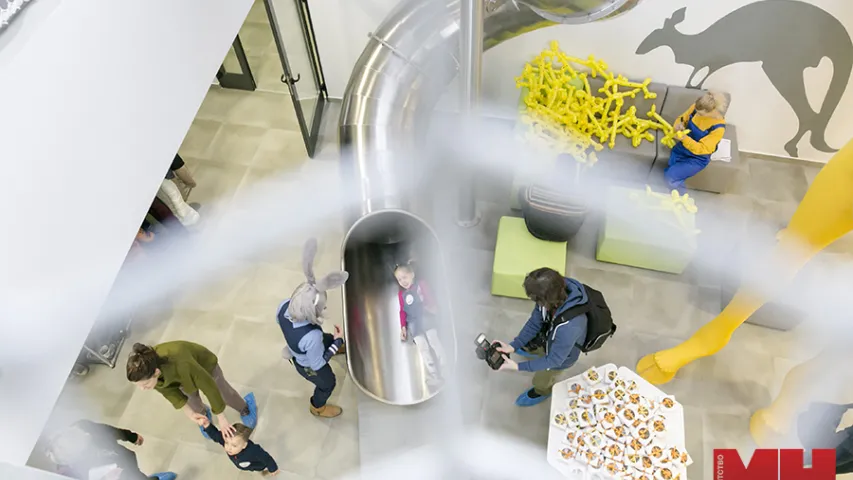 В учреждении дошкольного образования будет восемь групп, из них две — ясельные — всего 150 воспитанников. Группы для старших детей двухуровневые. Зона отдыха оборудована мебелью, которую собрали по индивидуальному заказу. В садике есть скалодром, в создании которого участвовали профессиональные альпинисты. Кухня находится на первом этаже, а для доставки пищи на второй этаж есть лифт.