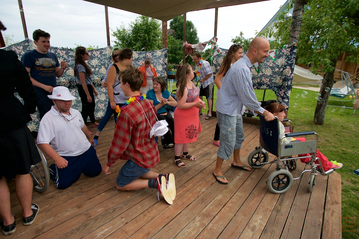 На смене работает 15 волонтеров. Кроме Катарины и ее парня — молодые ребята и девушки из Уэльса и Беларуси. Их день выглядит так: в 9 часов — завтрак, в 13 — обед, в 16 — полдник и в 19 — ужин. Между едой волонтеры готовятся к праздникам, проводят игры и ивенты, выводят воспитанников на озеро купаться. По вечерам вместе с подопечными (их 11 на смене) разжигают костер, проводят дискотеки или смотрят кино. Изредка выезжают в Минск. Однако, говорит Алексей, который проводит нам экскурсию по лагерю, это непросто, ведь в столице часто не хватает подъемников, которые помогали бы людям в колясках чувствовать себя комфортно и безопасно.