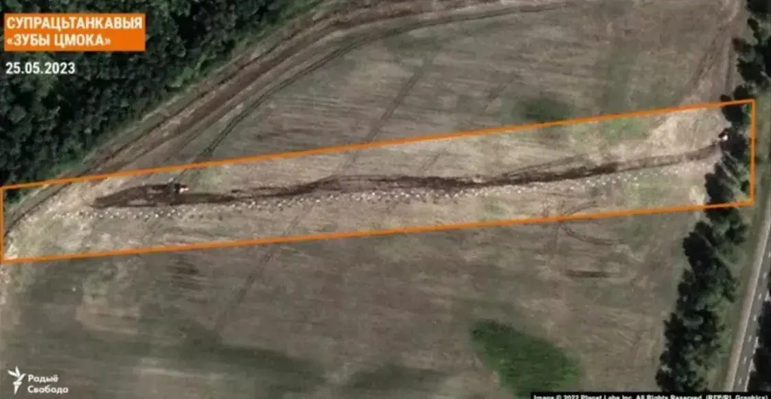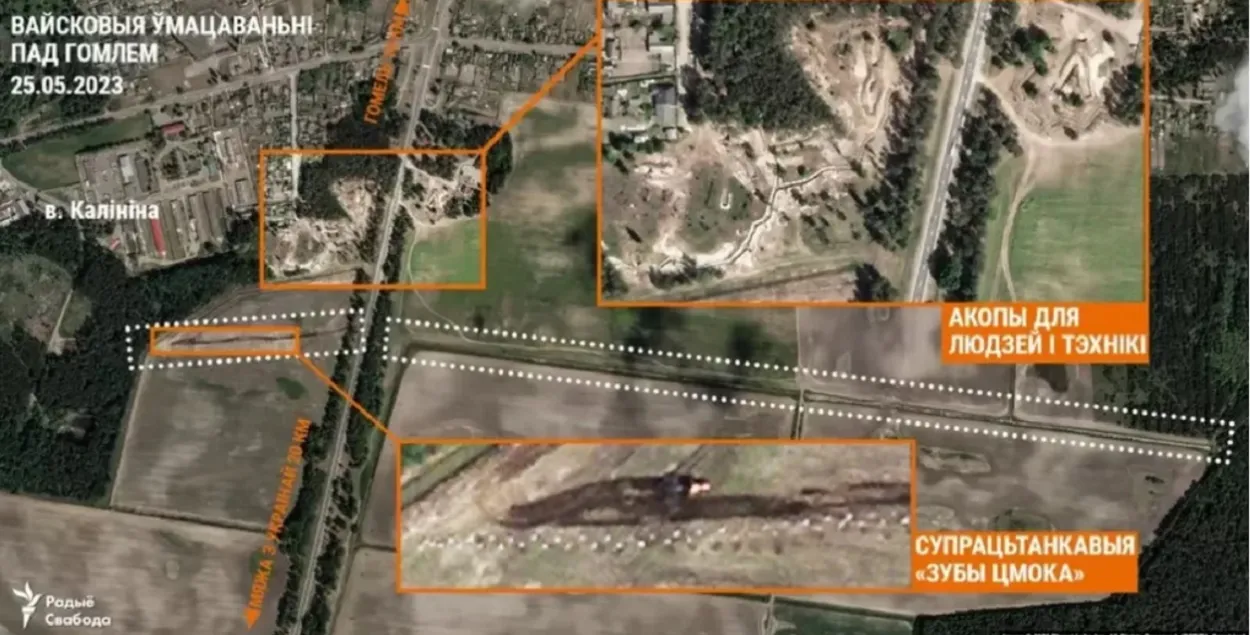 Радио Свобода опубликовало снимки со спутника так называемой "линии Хренина" в Гомельской области, которые 25 мая сделала компания Planet Labs. Общая длина оборонительной линии составляет около двух километров (400 метров западная часть и 1600 метров — восточная). Она находится в 10 км от Гомеля и в 20 км от границы с Украиной. Оборонительная линия состоит в том числе и из противотанковых "зубов дракона", которые должны замедлить продвижение бронетехники противника.