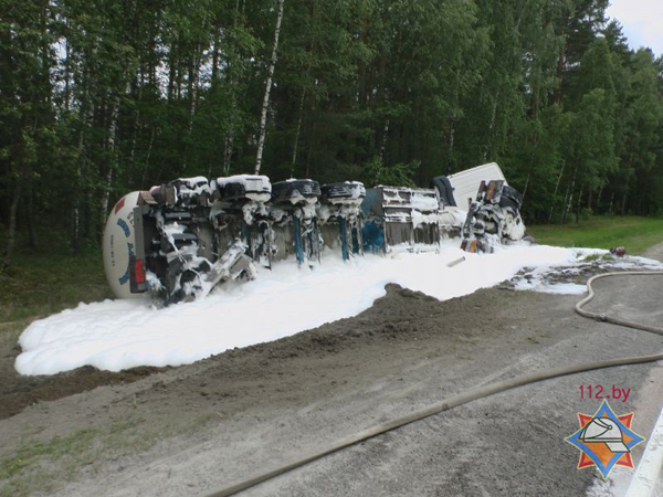 Грузовик "Вольво" с прицепом-цистерной съехал с автотрассы и опрокинулся. Он перевозил более 17 тонн смеси пропан-бутана. Как информирует пресс-служба МЧС, водителем оказался 57-летний гражданин Польши. Он вез груз в Белосток. Было выяснено, что поляк был сильно пьян.
