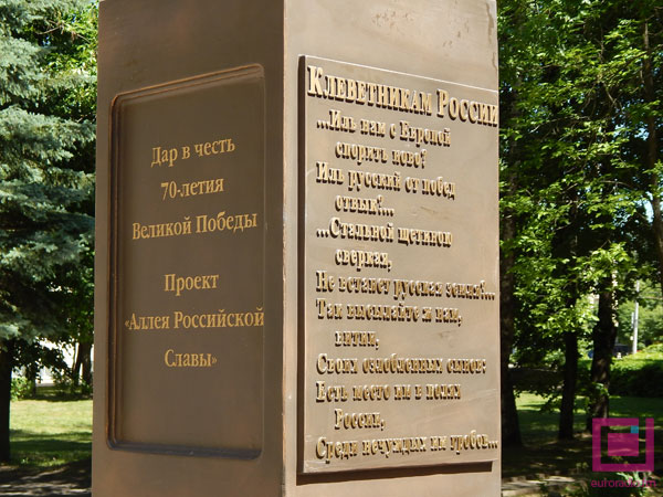 На колонне, которая держит бюст, размещены отрывки из стихотворений поэта. И если к отрывку из "Я помню чудное мгновенье" вопросов нет, то отрывок из "Клеветникам России" их вызывает много. Вот что там размещено: