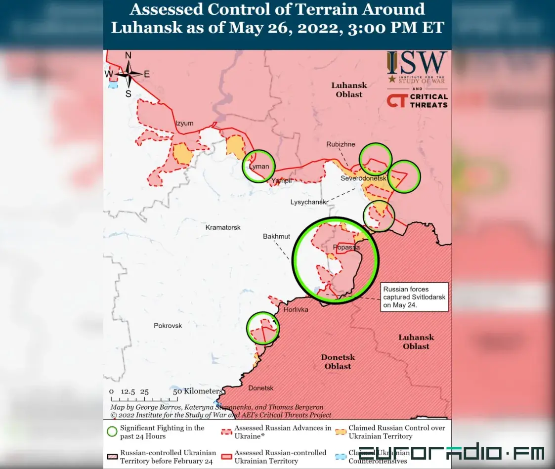 Основные усилия россиян приходятся именно на Восточную Украину. Там они хотят целиком захватить Донецкую и Луганскую области. Поэтому российские войска заняли несколько сёл к северо-западу от Попасной накануне 27 мая. Так они пытаются окружить Северодонецк и Лисичанск, пишет Минобороны Великобритании.