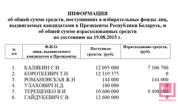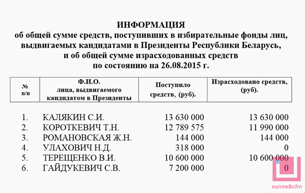 26 августа на сайте ЦИК появились свежие данные о денежных средствах, перечисленных в избирательные фонды претендентов на пост президента Беларуси. Фондов по-прежнему шесть (с учетом Сергея Калякина, который подписи не сдавал, и Жанны Романовской, которая сдала их очень мало), Александр Лукашенко фонда не создал.