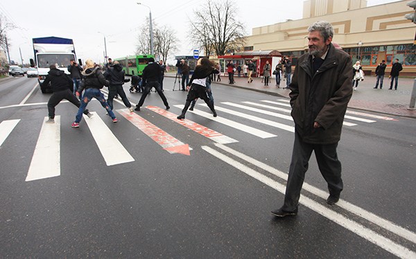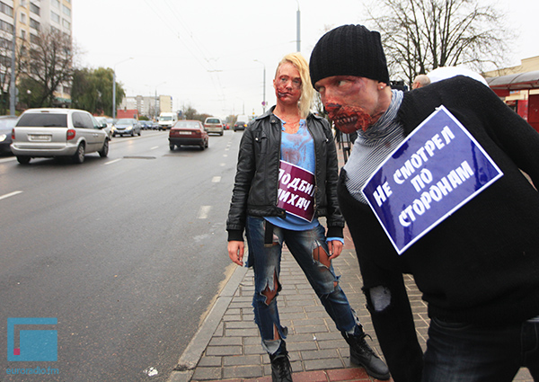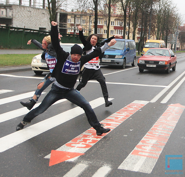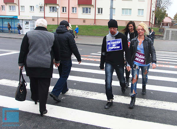 Совместно с шоу-балетом Евгения Якуша во вторник, 22 октября, она провела акцию для пешеходов и водителей. На одном из центральных проспектов города прохожие, а также водители автомобилей наблюдали за танцующими на пешеходном переходе "окровавленными" артистами, которые загримировались под жертв аварий.
