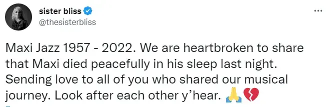"Мы с болью в сердце сообщаем, что прошлой ночью Макси мирно скончался во сне. Шлём любовь всем вам, кто разделял наше музыкальное путешествие. Берегите друг друга", — написала она.