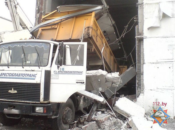На месте происшествия спасатели обнаружили, что при выезде из помещения мойки грузового автомобиля МАЗ-5516 обвалились две стеновые гипсокартонные плиты над калиткой.