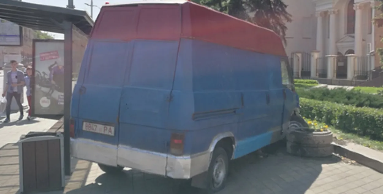 В самом центре Минска, на площади Свободы микроавтобус выскочил на тротуар. На лобовом стекле машине не было отметки о прохождении техосмотра. Свидетелем этого инцидента стал известный блогер Антон Мотолько, разместивший снимки с места происшествия в Твиттере.